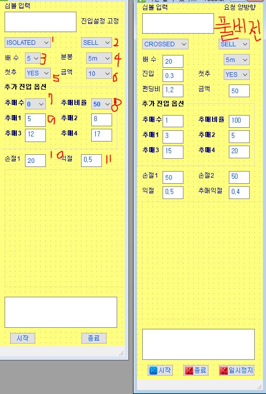 9.추매1,2,3,4 는 추매되는 %로 평균단가에서 마이너스 %임 롱은 아래로, 숏은 위로 설정됨