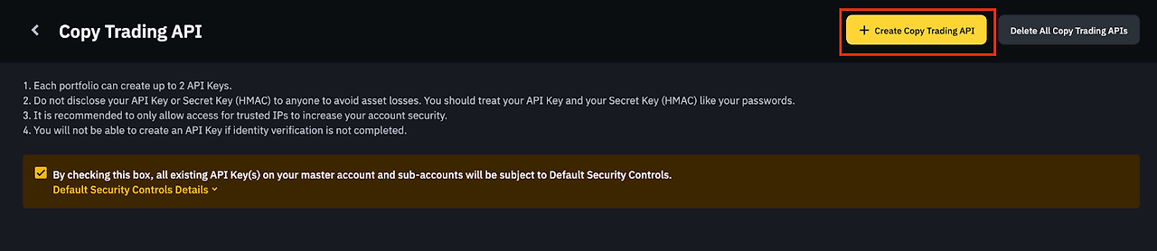 - 리드 트레이더는 각 선물 리드 포트폴리오에 대해 최대 두 개의 API 키를 생성할 수 있습니다.